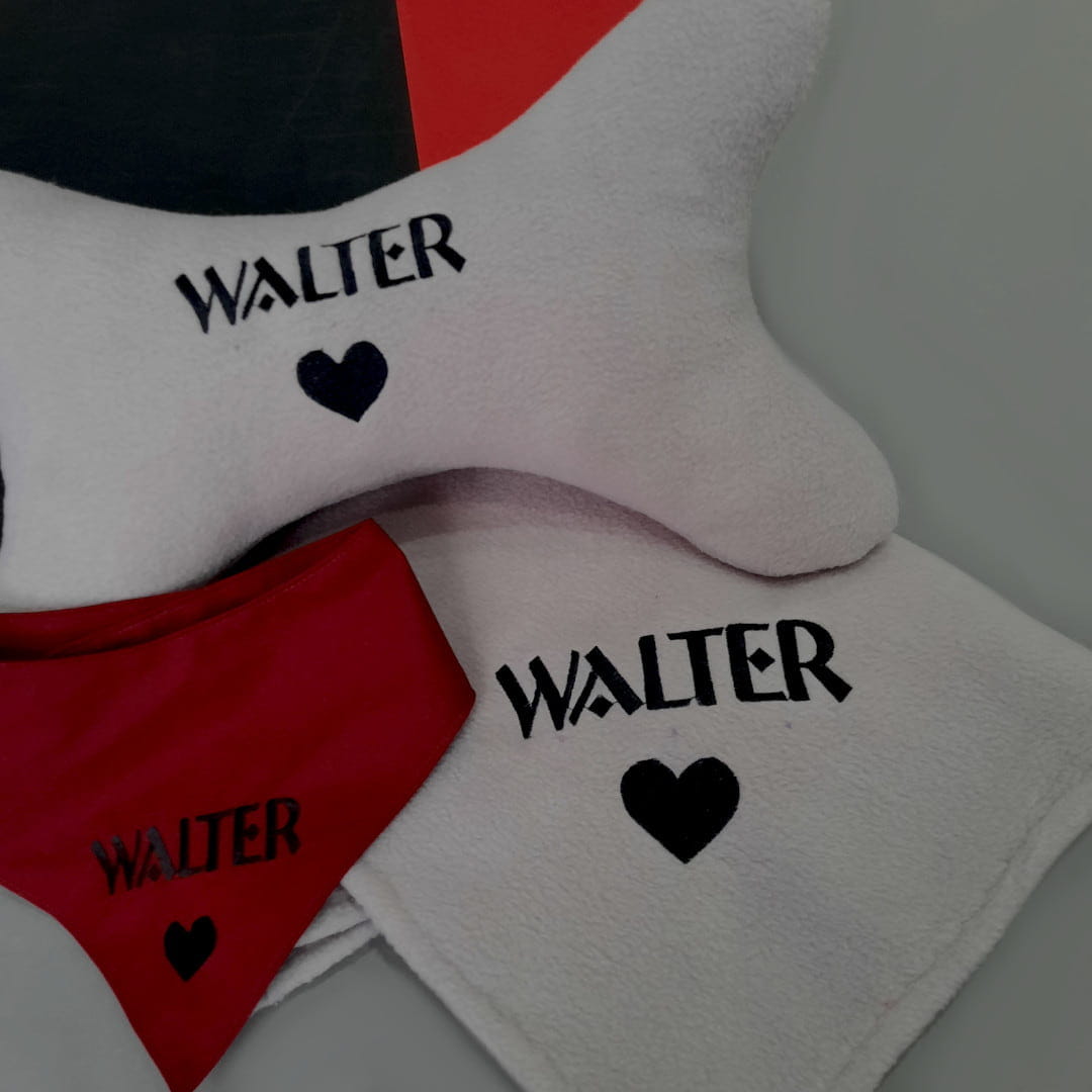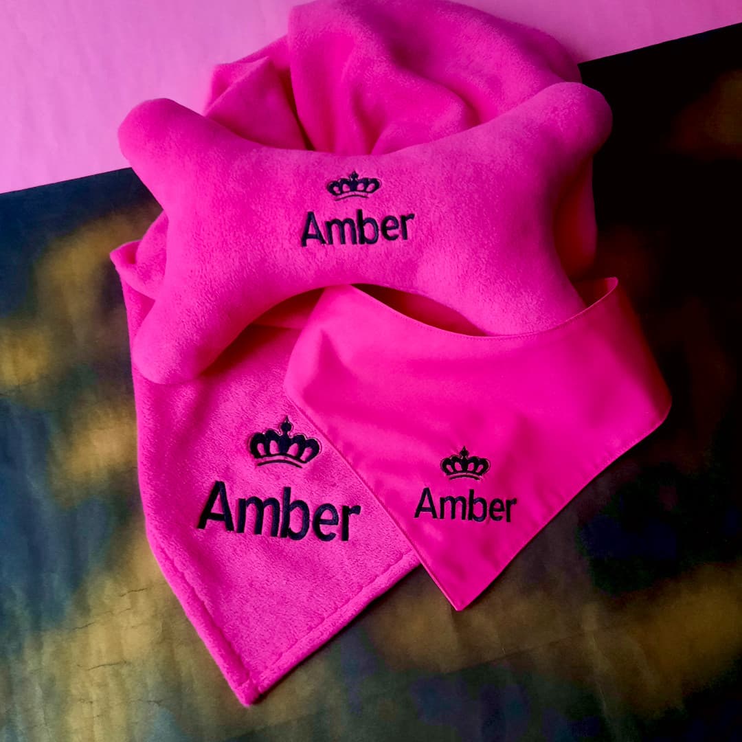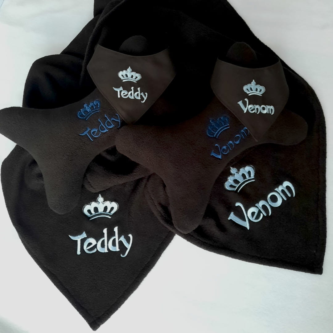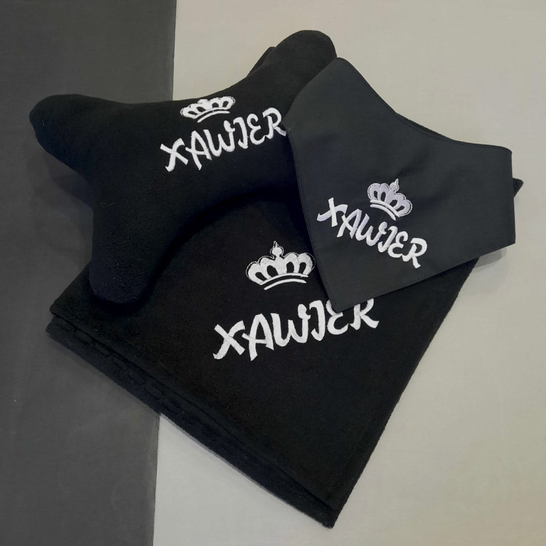 Zestaw, który składa się z poduszki, kocyka i apaszki dla psa z jego imieniem wykonane są na Twoje zamówienie, wg Twojej specyfikacji. To Ty wybierasz rozmiar, kolor zestawu, kolor haftu, na który składa się z imienia psa i motywu, i wreszcie decydujesz o rodzaju czcionki jaką ma zostać wyhaftowane imię. Taki zestaw to piękny prezent dla psa i jego właściciela. Wykonany jest z miłego w dotyku polaru, jest ciepły i łatwy w użytkowaniu. Idealnie sprawdzi się jako dodatek do legowiska dla psa. Przyda się również do samochodu podczas wspólnej podróży.