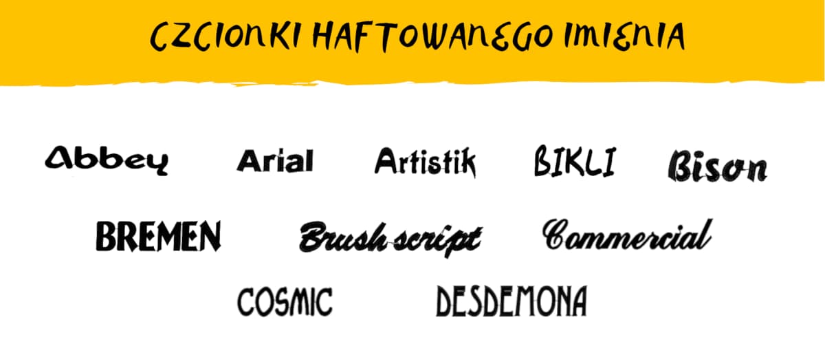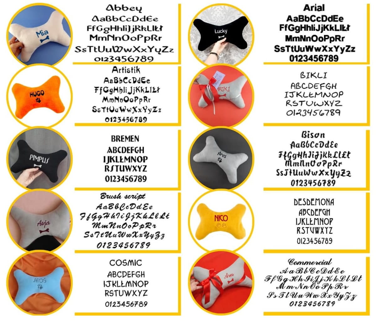 Zobacz jak poszczególne czcionki prezentują się na gotowym produkcie. Szerokość poszczególnych liter i cyfr różni się w zależności od rodzaju czcionki. Zwróć też uwagę, że niektóre czcionki składają się tylko z dużych liter (np. bikli, cosmic) i wtedy podane przez Ciebie w zamówieniu imię będzie wyhaftowane właśnie dużymi literami.